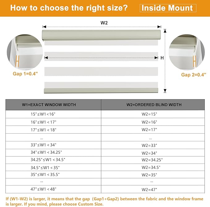 - 【How to choose a correct size to fit? Example your window meas 23" width x less than 72" Height.】INSIDE MOUNT: Window Width is Blind width. Blind Width=23"; Blind Height=72". OUTSIDE MOUNT: Plus at least 4" is blind width, Blind Width=23"+4"=27"; Blind Height=72".【Pls Note】Fabric width will be 0.8" narrower than the size of the blind.