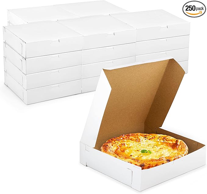- Dimensions: 10” length x 10” width x 2.5” height, with a total of 250 high-quality white boxes per pack. The size is ideal for packaging small pies, candies, pastries, mini muffins, cupcakes, and cookies.