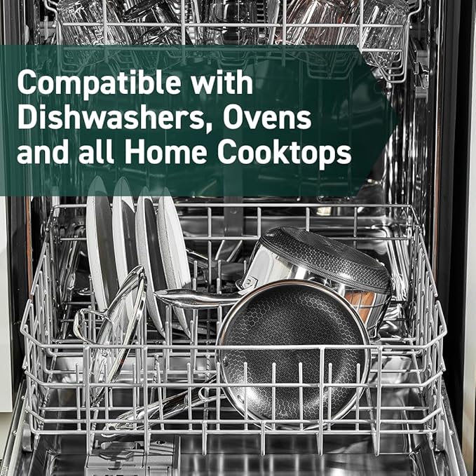 - Tri-ply construction with an aluminum core for quicker even heating, it’s safe to use on any home cooktop or stovetop, including induction. HexClad is metal utensil-safe, dishwasher-friendly, and oven-safe up to 900°F. (Tempered glass lids are oven-safe up to 400°F, while stainless steel lids are oven-safe up to 900°F.)