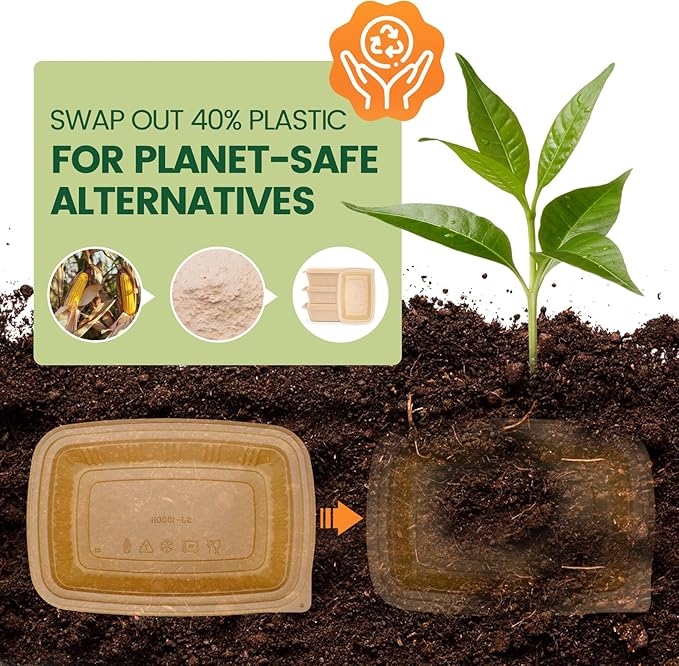 - ✅ Corn Starch-Based Plant Containers & Lids: Set includes 50 containers and 50 matching lids. Odor-Free Lunch Box! Made from 40% plant-based cornstarch and food-grade PP, these food storage containers reduce plastic waste by 40%. Ideal for eco-conscious homes and businesses seeking sustainable alternatives.