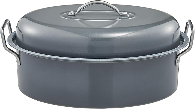 - Premium Granite Non-Stick Coating: Featuring an upgraded luxury granite non-stick coating, our turkey pan keeps food intact while making cleanup effortless. This innovative surface absorbs and distributes heat evenly, speeding up cooking time while sealing in moisture for mouthwatering results. Plus, our roasting pan with lid is free from harmful chemicals like PFOA and PTFE, ensuring a safe cooking experience that won’t react with acidic foods.